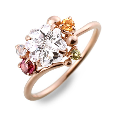 クローバーモチーフのキュービックと、数種のストーンのデザインが贅沢なピンクゴールドリング。細みの華奢なアームと美しいストーンのきらめきが、繊細な美しさを醸しだしているデザインです。Blue Cat ブルーキャット ピンクゴールドリング キュービックジルコニアロードライトガーネット シトリン ペリドット ブルームーンストーン